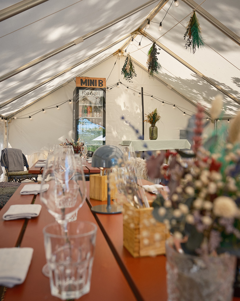 MiniB er vores mest intime selskabstelt – et lukket og eksklusivt rum skabt til mindre grupper på 10–30 personer. Her er der tid og plads til nærvær. Stemningen er varm og personlig, og omgivelserne gør det let at falde til ro og bare nyde selskabet. MiniB er oplagt til mindre bryllupper, runde fødselsdage eller særlige middage, hvor man ønsker privatliv, ro og et højt gastronomisk niveau i uformelle rammer.