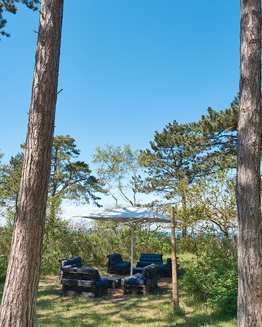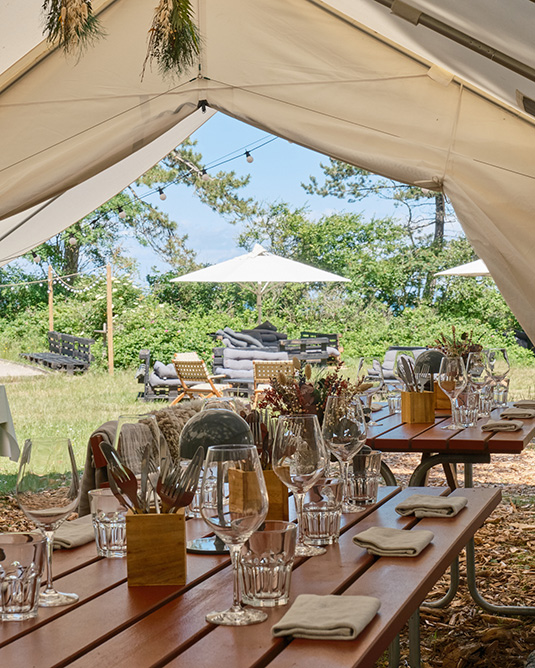 Vores store telt danner en elegant, men afslappet ramme, hvor I kan nyde de lange sommeraftener med vin i glasset, havluft i håret og stemningen af ferie og frihed.